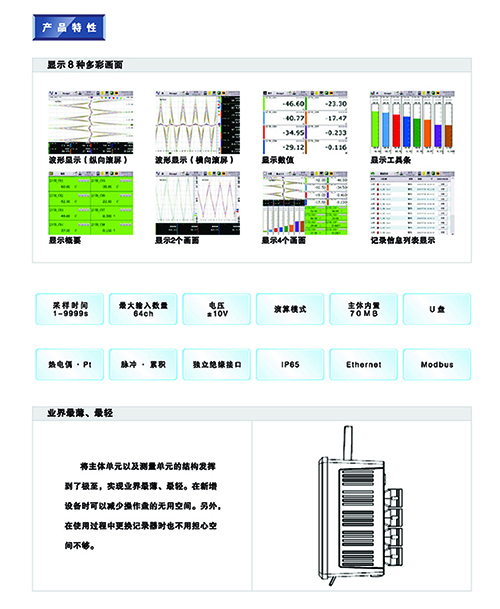 觸屏無紙記錄儀主機最多可以輸入8~64個通道通,外接模塊可以無限擴展 ,TP7000系列觸屏數(shù)據(jù)記錄儀將主體單元和測試單元的結構發(fā)揮到了極至,實線了業(yè)界最薄最輕。